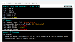昨晩も相変わらずHF Impact LevelはMinor Stormの状態で、全バンドUnstableとなっており、唯一20mがWeak程度になっておりました。磁気嵐もMajorからMinorに下がりましたが、以前続いているようです。