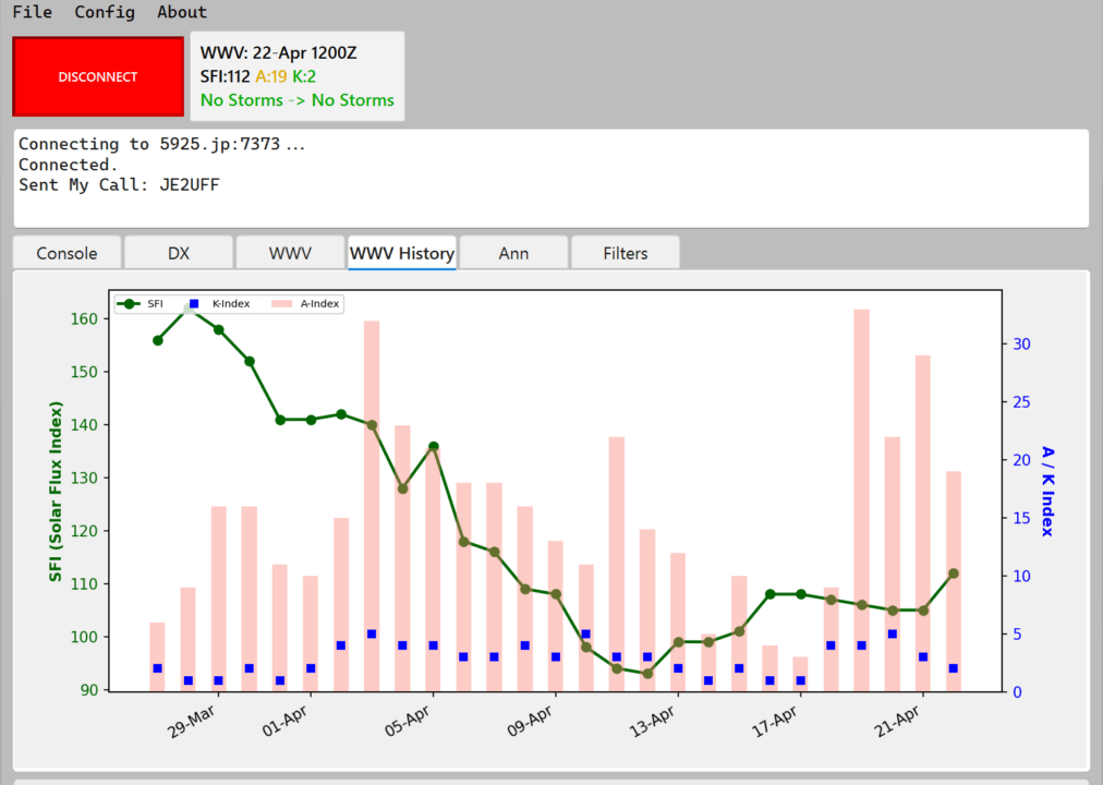 さて、コンディションは回復方向のようでSFIも上がりだしK-Indexは下がって来ている。A-Indexが若干高いのが気になるが、SFIが上昇してくることで電離層が活性化してくると思われる。